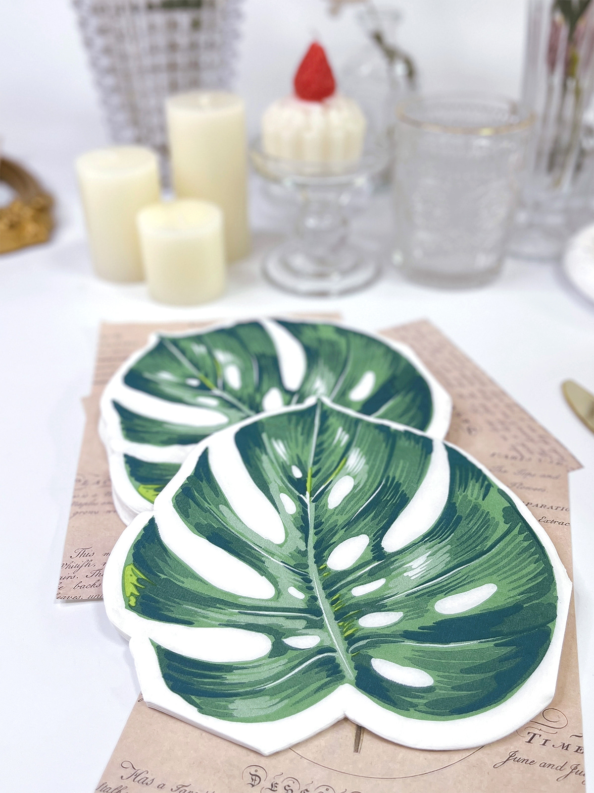 Is soláthairtí páirtí ardchaighdeáin iad na naipcíní páipéir glas-chruthach duille seo do pháirtithe ar théamaí jungle agus Haváís. Léiríonn an dath bríomhar glas mothú dóchais, agus cuireann an dearadh díscriosta teagmháil iontach leis a thaitneoidh le do theaghlach agus le do chairde.